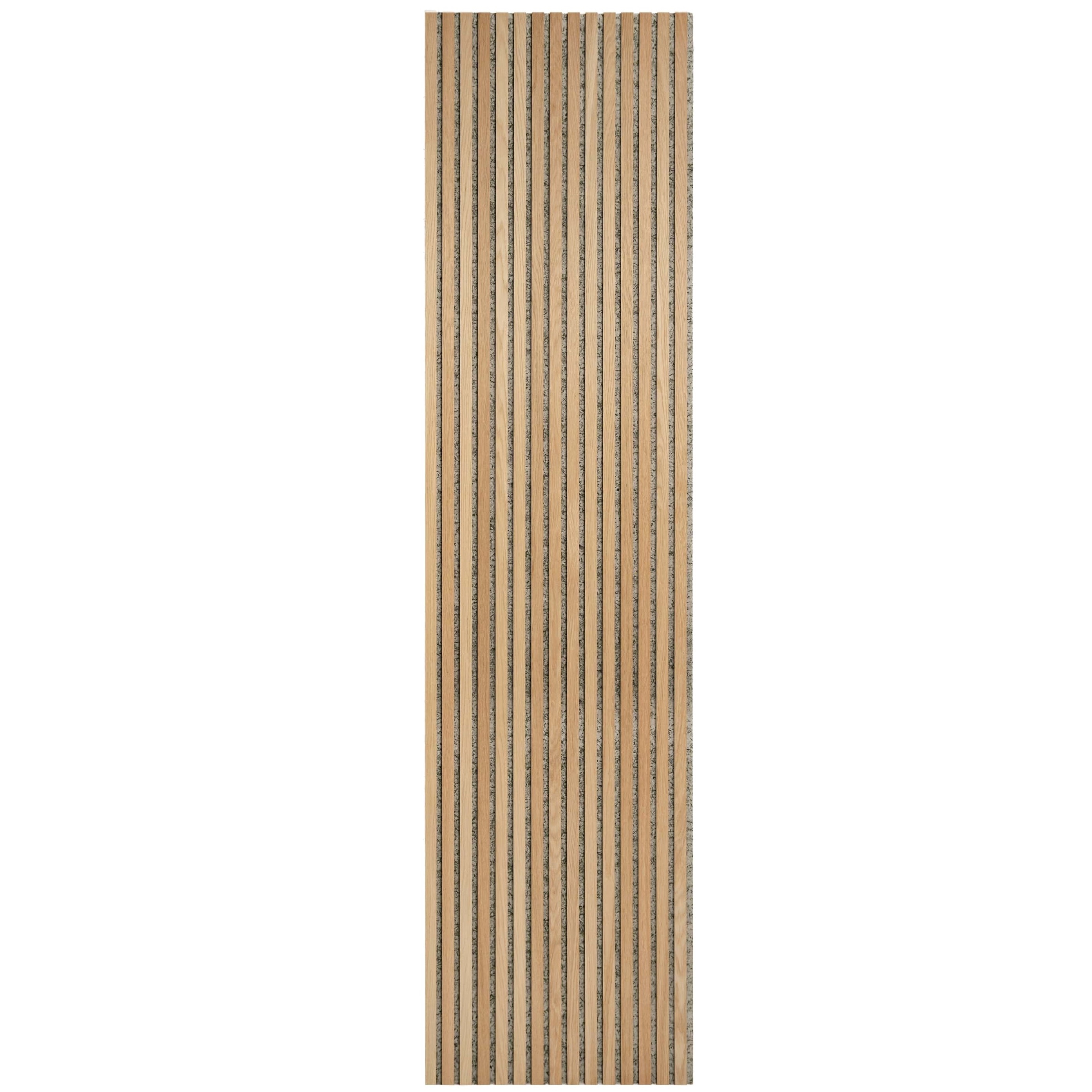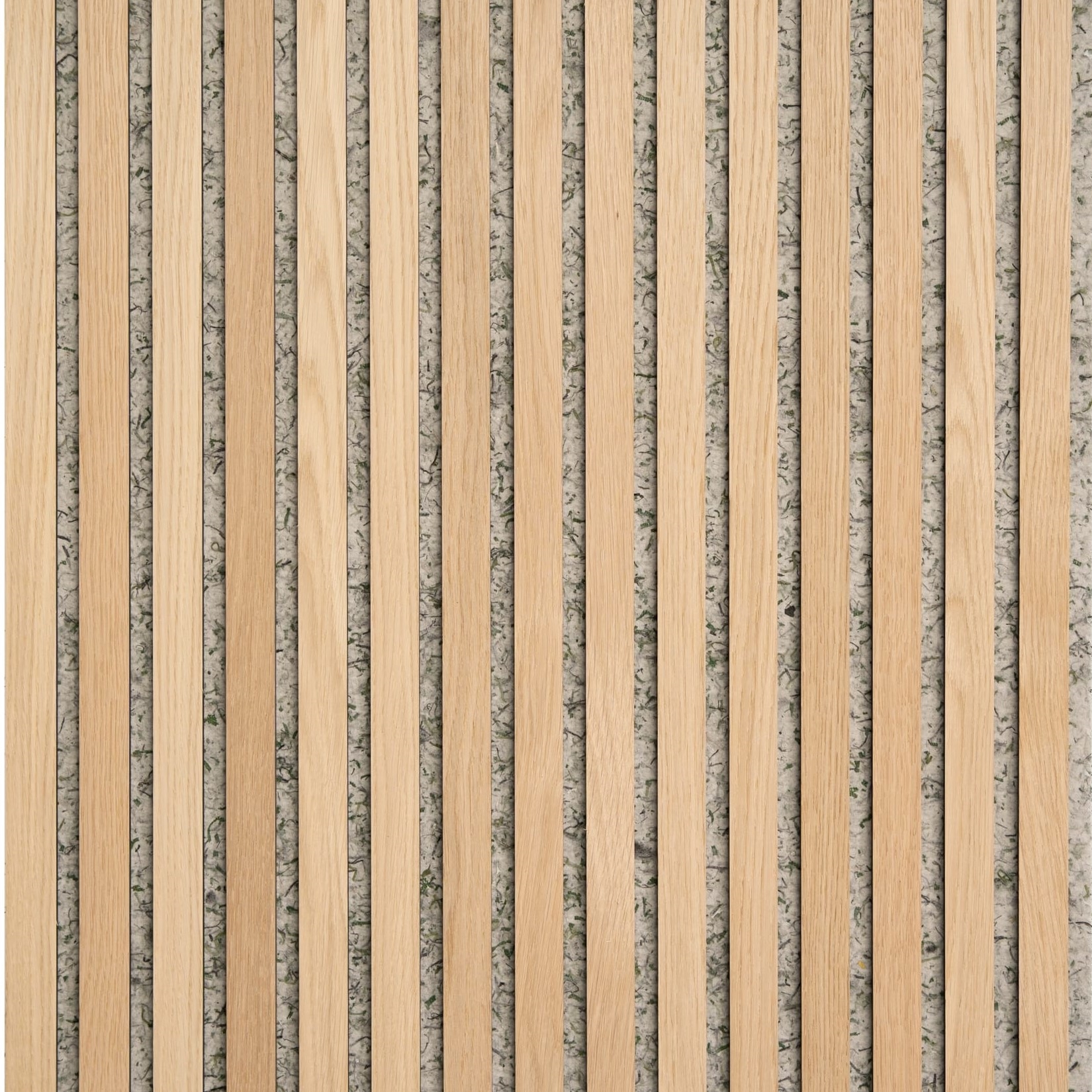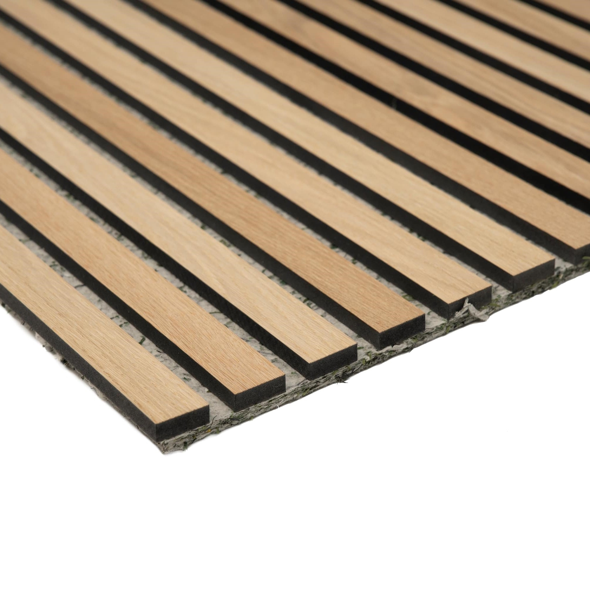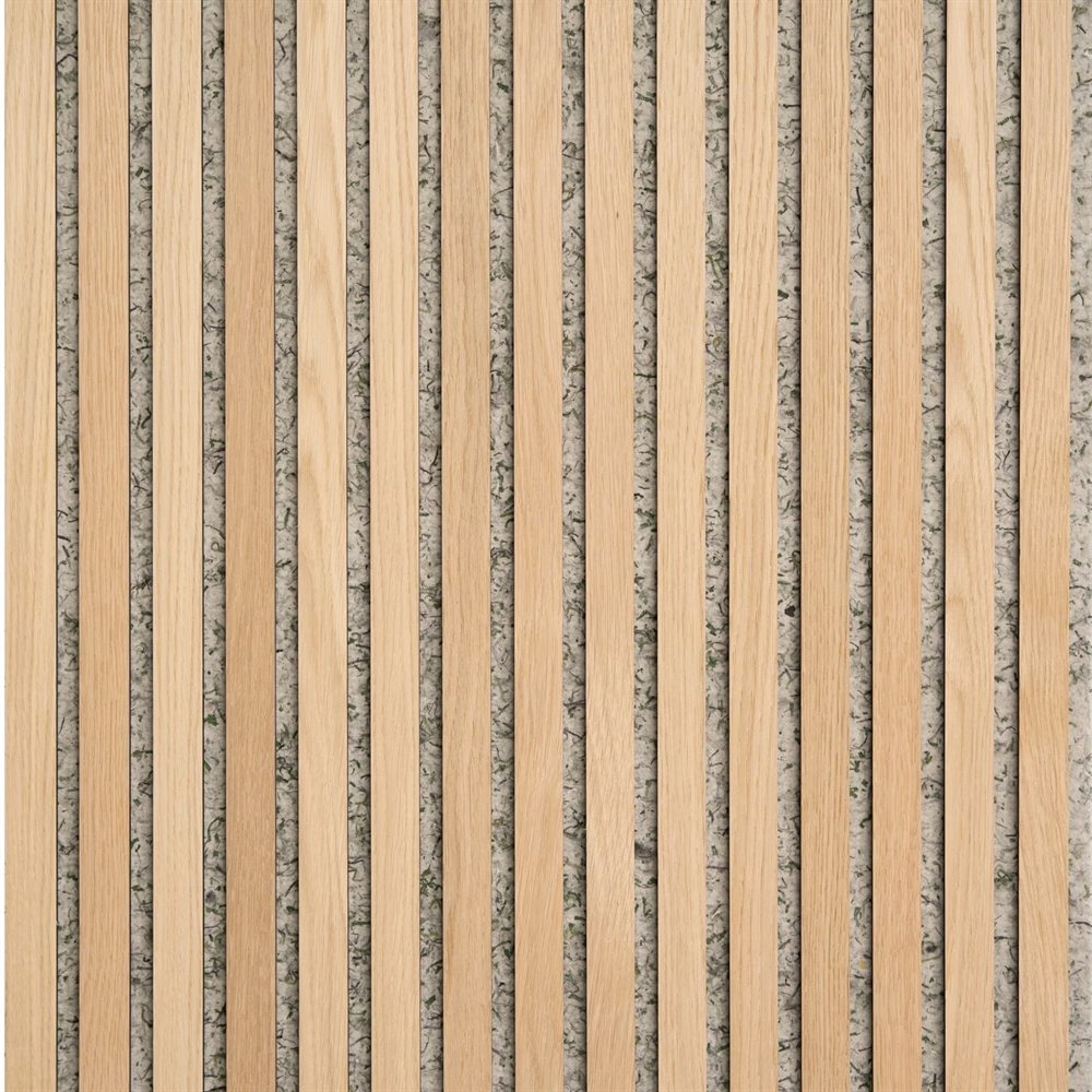 Akustikpaneler med eg på sort MDF og grå/grøn filt